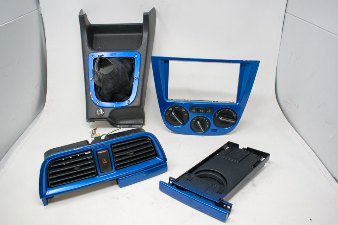 On sale now is a genuine 2002-2004 OEM JDM Subaru Impreza WRX STI V7 WRB interior trim kit. This kit includes the climate control unit and bezel, air vent with cup holder, and STI shift trim. Please refer to all actual item photos for a complete cosmetic description.